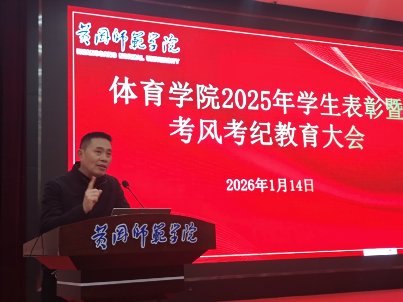 为表彰学业典范、弘扬拼搏精神,严明考试纪律、筑牢诚信根基,体育学院于2026年1月14日晚19:00,在厚德楼学术交流中心召开“体育学院2025年学生表彰暨考风考纪教育大会”。出席本次会议的有学院全体班子领导成员、二级机构负责人、辅导员、班主任及学院全体学生。会议由副院长凌波主持。