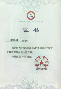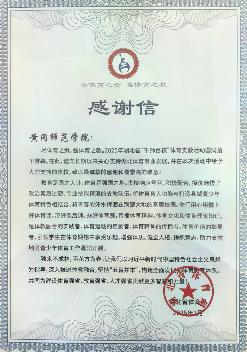 大会分为成果展示与专题座谈两个环节。在成果展示部分,与会代表集体观看了全省体育支教工作纪实视频,并参观了支教成果展览,全面回顾了一年来支教行动的生动实践与显著成效。表彰环节中,省体育局为各高校支教志愿者代表颁发了纪念证书,我院2022级体育教育专业学生陶鹏浩、廖毅恒作为代表上台领取,展现出黄师体育学子奉献担当的精神风貌。随后,湖北省体育局副局长骆启义向积极参与支教的十所高校体育学院负责人颁发了感谢信,对我院在组织动员、人才培养与服务地方等方面所作的贡献予以肯定。徐金陆院长代表学院接受了这一荣誉。