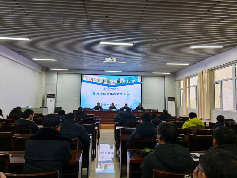 2026年1月31日上午9时30分,体育学院在体育运动中心205会议室召开全体教职工大会,宣布学院新一任领导班子调整决定。校党委副书记王基家、党委组织部部长周俊飞出席会议,体育学院全体教师参加。会议由周俊飞主持。
